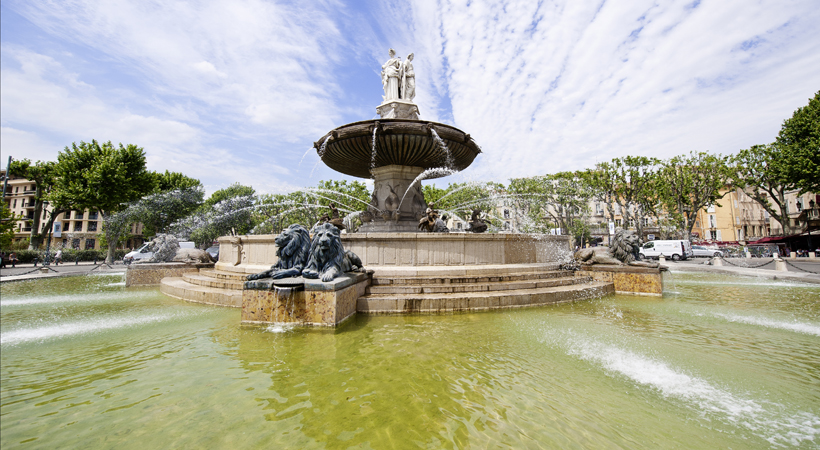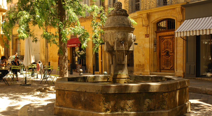 Aix-en-Provence, chiamata al tempo dei romani AquaeSextiae, conta oltre 40 fontane che ricordano l’antico legame con l’acqua. A tutt’oggi è una città termale e le sue sorgenti calde e fredde offrono al visitatore una vacanza salutare e rilassante. La più grande e famosa fontana è sul Cours Mirabeau, la via principale della città con i suoi caffè e botteghe, ricca di eleganti palazzi dalle facciate aristocratiche e dai portoni decorati con preziosi fregi.