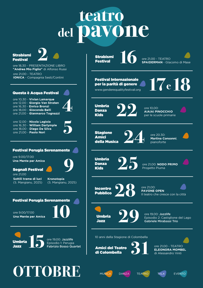 Il Teatro del Pavone si propone come laboratorio culturale permanente, uno spazio pubblico aperto, inclusivo, dove il Comune di Perugia collabora con festival, rassegne, associazioni, enti e istituzioni per costruire insieme una programmazione che sia espressione della città e per la città.