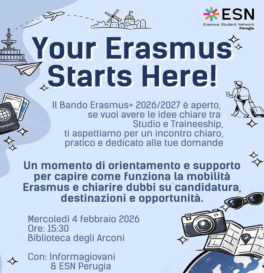 Incontro all'Informagiovani del Comune di Perugia mercoledì 4 febbraio dalle 15.30 per scoprire tutto sul Bando Erasmus+ 2026/2027 con l'Associazione ESN Perugia - Ingresso gratuito