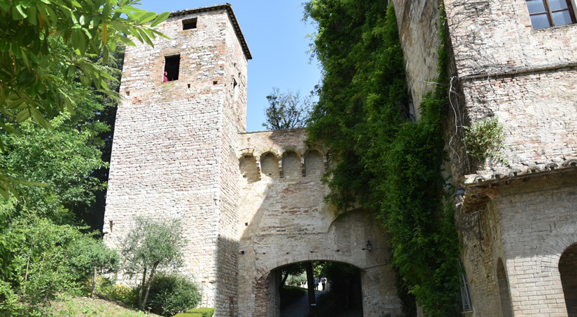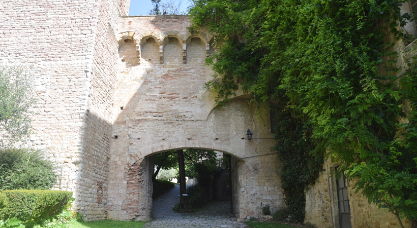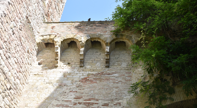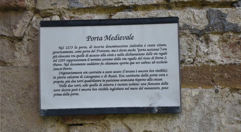 The arch was modified into a lowered one, but the original pointed arch is visible in the inner façade. It was delimited by two quadrangular towers, today, only the left one is visible. The other one was absorbed in the XVI Century monastery enlargement. With the Construction of San Costanzo Gate (1587), this ancient door remained in the monastery gardens where it can be seen today.