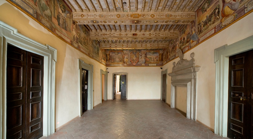 Del primitivo impianto resta soltanto il salone al piano terra, dipinto nel seicento con storie dell’epopea familiare.