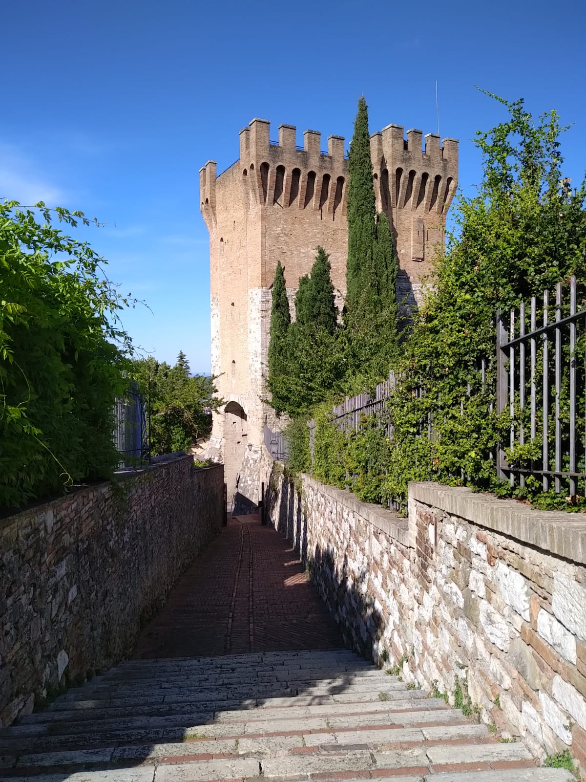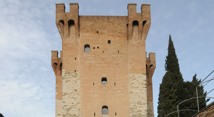 Outside it presents three levels, of three different construction phases, each marked by the use of different materials. The first is of sandstone, like the walls of the same age. The second level was made with limestone, probably dating back to the ‘70s of the XIV Century; this part was expressly wanted by the “legato pontificio” (Papal Legate) Gérard du Puy, known as Abbate di Monmaggiore, who, considering the strategic importance of the place linked it to the fortress of Porta Sole and to the Porta di S. Antonio. The third level, made of bricks (1416-24), was projected by the Architect Fioravante Fioravanti, following the orders of the Lord of Perugia Braccio Fortebracci. The definitive transformation in keep, with trapdoors, slits and embrasures dates to 1479 .