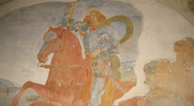 The chapel, built in brick and river pebbles, is characterized on the outside by a small porch and the bell tower; the inside is a square hall with a cross vault and a lunette. On the walls, a pictorial cycle attributed in 1981 by Sylvia Ferino Pagden to Andrea d’Assisi called Ingegno, a pupil of Perugia; attribution recently confirmed also by numerous intellectual such as Lunghi, Todini, Fratini and Teza. In the back wall, a Madonna adoring the Child is represented, surrounded by a crown of cherubs; on its sides there are two saints: San Cristoforo, with the Child on the shoulder, and San Bernardino da Siena, identifiable by the IHS trigram, testimony of the presence in the area of the Frati Predicatori Osservanti in the XV century. On the right wall San Giorgio on horseback attacking the dragon (missing figure) and freeing the princess is represented, on a marine or lake background, whose frescoed image is seriously deteriorated. On the left wall is represented San Martino giving the cloak to the poor, a clear reference to the patron saint of the pieve on whose territory the small church stands. The ceiling has fragments of a monochrome decoration with medallions and frames in classical style.
