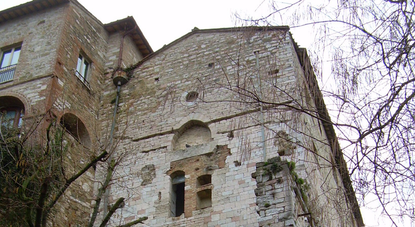 E’ addossata al muro etrusco con un’abside aggettante che la fa apparire come sospesa nel vuoto. Presenta una struttura architettonica ad aule sovrapposte