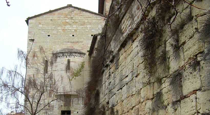 It leans against the Etruscan walls with a protruding apse that seems suspended and has a structure with overlapping halls.