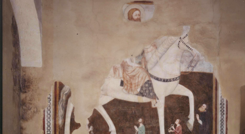 In the inner wall of the façade, a San Leonardo riding a horse and releasing the prisoners; identified also as San Sargis, a IV Century martyr venerate by the Armenians as the embodiment of Armenia political and religious independence aspirations.