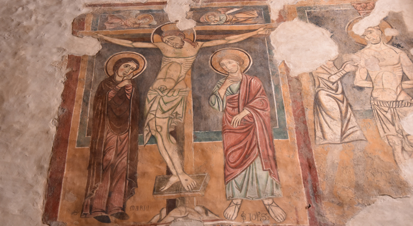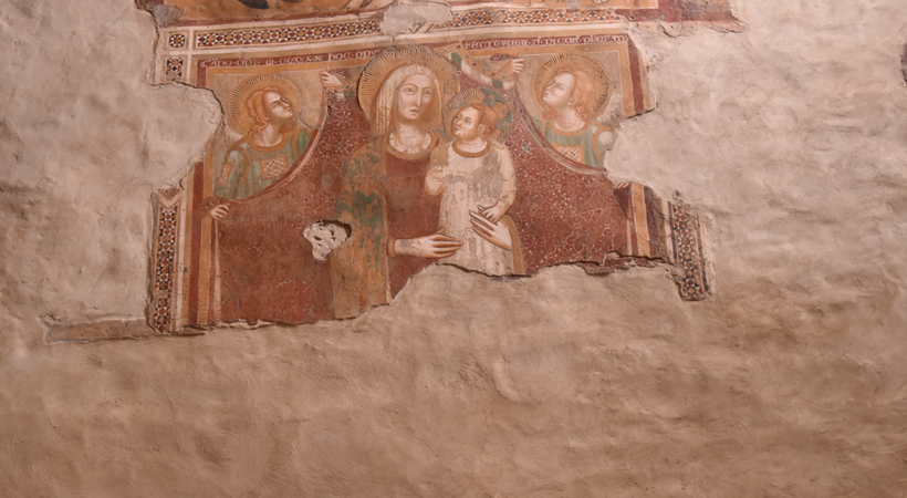 The older one (1260) is in the upper part: a Crucifixion and a Flagellation that, because examples so rare of painting of the same period, are of the utmost importance in the history of Art in Umbria. They were made later than those in San Prospero Church (1225) but in the same period of those in San Bevignate Church (1260-70). A graphic painting style coming from, as stated by the Art Historian P. Scarpellini, the Art of Illumination. It shows a strong black boarding line, and at the same time the “Christus patiens“ iconography, used for the first time by Giunta Pisano.