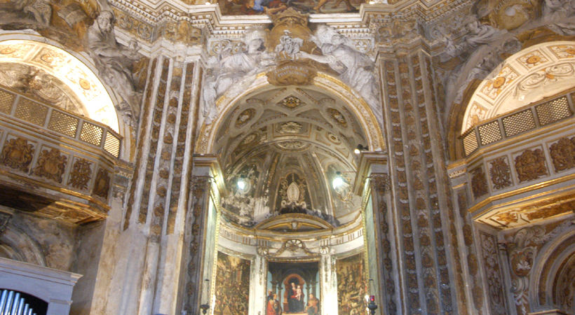 L’interno presenta una ricca decorazione barocca.
