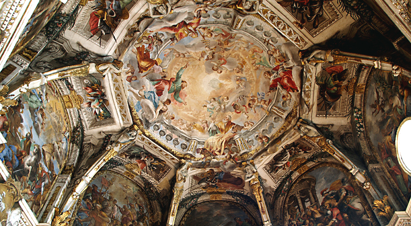 The interior has a rich Baroque decoration.