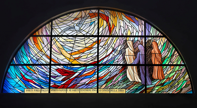 The polychrome glass windows were made, in 1954 and 2011, by the historic Perugian laboratory Moretti-Caselli.