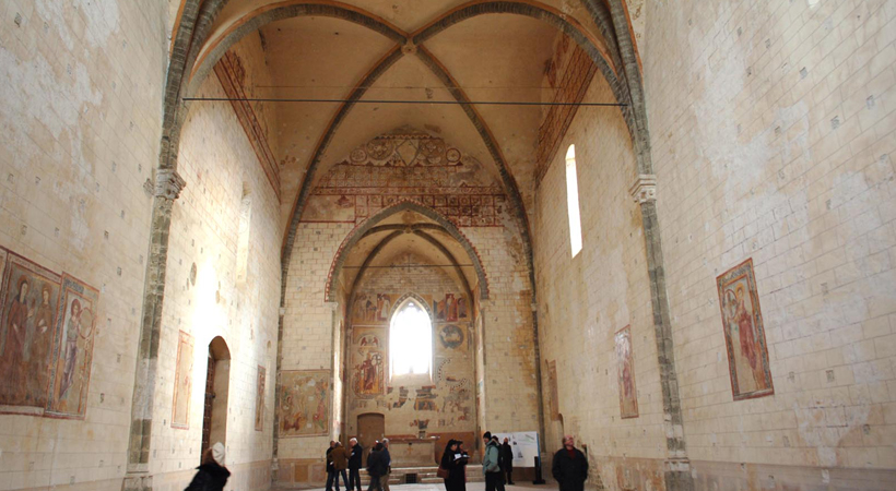 The church of St. Bevignate is one of the most important and better-preserved monumental testimony among the complexes of the Templar Knights, the Order created in Gerusalem around 1119 by the French knight Hugues de Payns, and after that rooting all over Europe. Outside the structure is sombre and mighty, while inside it is lighted by a game of slender ribs. The wall decorations, among the rare examples of XIII Century paintings in Perugia, show the History of the Order, together with characters and important events in the Umbrian Middle Ages (from San Bevignate to the flagellants). On the counter-façade a pictorial cycle on the mission in the Holy Land: a tale by images telling the actions of the Militia Templi, from the sea voyage to the Nablus battle (1242). In the apse, together with some biblical scenes destined to liturgy and the upbringing of the people, a spectacular depiction of the Last Judgment, in which local elements intermingle with transnational ones, giving out the real essence of the Order that, for over a century, linked East and West.