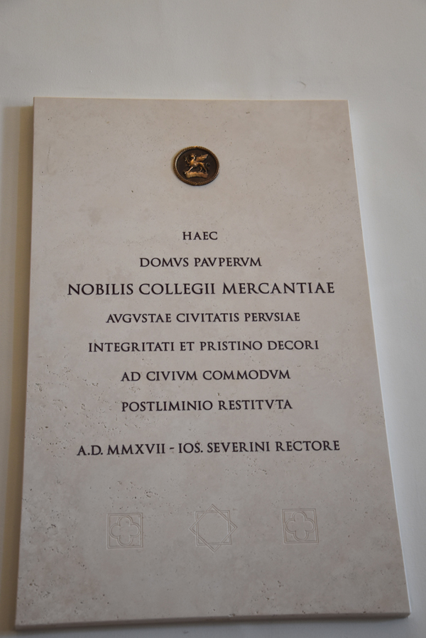 The Domus Pauperum is an imposing renaissance hall, with cross vaults, divided into three naves by two rows of travertine columns with capitals. Right in the centre of the district of Porta Sant’Angelo (today 84, Corso Garibaldi), it was built in 1507 by the Collegio della Mercanzia (Merchants Guild) – the dominant corporation for the government of Perugia – as shelter for those in need; it remained such till 1990. It was made on the pre-existing volume of the Hospitale Mercatorum, as seen in documents of 1321, meant for foreigners merchants, pilgrims, destitute people. The brick façade shows three stone emblems of the Mercanzia, the passing Griffin of a wool bale. The beautiful walnut central entrance door shows the name and date MCVII (1507).