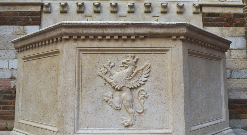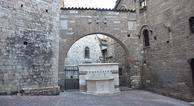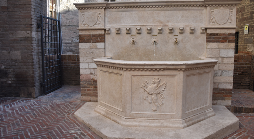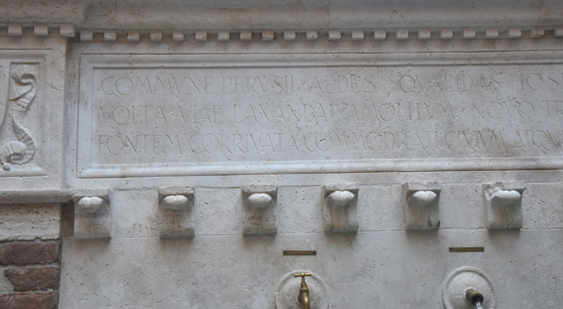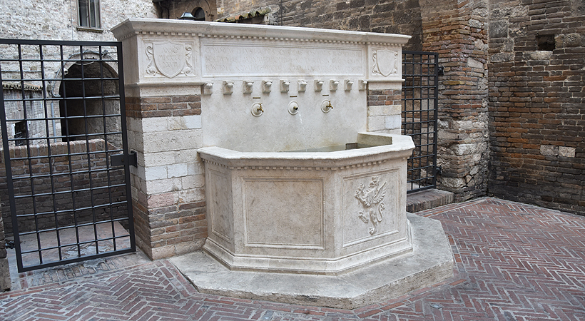 The source, built in medieval style, fits harmoniously into the context of the street, so much that it seems coeval, but the inscription in Roman characters refers to the XX century. In the central panel of the basin, as in other fountains and public buildings, the griffin, symbol of Perugia, is carved.