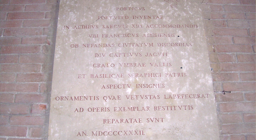 The Loggia dei Lanari is a white and pink stone building of 1300, restructured in the XX Century, composed with brick vaults and big arches facing on Monte Subasio and the Umbrian landscape. It was entitled to the craft of Lanari(wool craftsmen) because it hosted spinning workshops. It was also a refuge for pilgrims. A headstone of 1932 reminds that this is the place where San Francesco was imprisoned, intending the area not the specific building. Actually, the whole Piazza del Sopramuro (today called Piazza Matteotti) was built in different periods, all subsequent to the death of San Francesco.