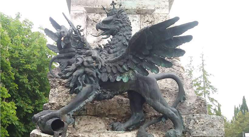 The griffin of Perugia is represented on the south side of the monument. It is grinding with a claw the papal tiara, as representation of the ending of pope temporal power; with the other claw the griffin grinds tyranny represented by Idra (the untamable mythological snake). The papal tiara has been removed during the period of the Fascist regime after the agreements between the Government and the Church; it has been reinstated in 1980 with the restoration of the monument.