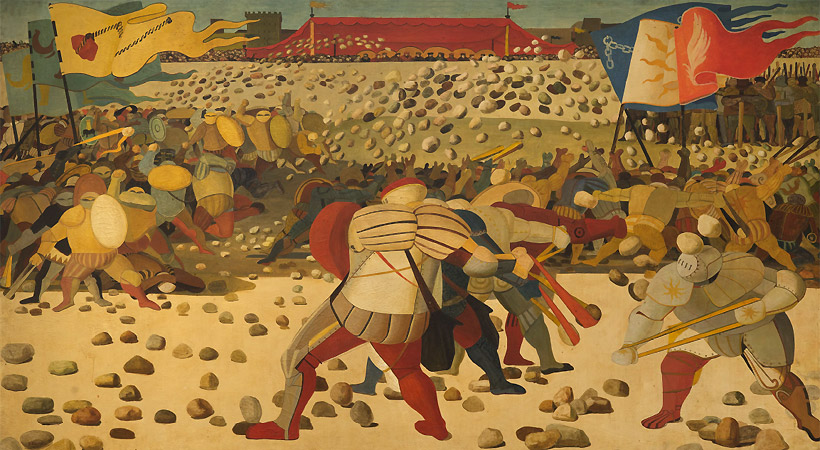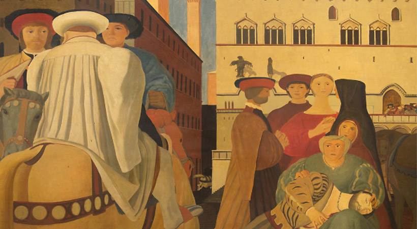 In the battle paintings there’s a clear echo of the renaissance paintings by Paolo Uccello and Piero della Francesca. The figures of the two saints, Benedetto and Francesco represent the image of pace and religiosity, symbols of our Region. In 1988, the ten paintings were donated by the “Perugina S.p.A.”, by Bruno Buitoni’s will, to the Region of Umbria, requesting only that they could be permanently seen.