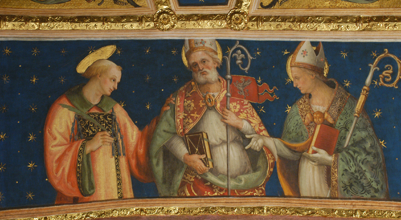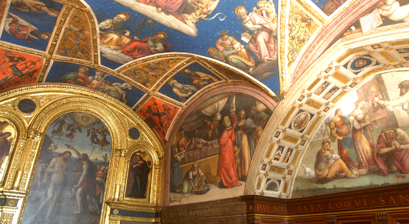 The entrance is through the Sala dei Legisti (Jurists’ Hall), with the wooden counters, carved and inlaid by Giampiero Zuccari (1615-1621), after the Sala delle Udienze (Audience Chamber), destined for the meetings and the audience of the public. The inlaid wooden furniture are by Antonio da Mercatello and Domenico del Tasso (1490-1501). The walls are frescoed by Pietro Vannucci, better known as Perugino (and assistants) between 1498 and 1500, one of the most famous Renaissance art example, inspired by an iconographic programme according to the Neo–Platonic philosophic ideas. In The Decoration of Houses by Edith Wharton these frescos are defined as one of the “three perfect ceilings of the world” along with those by Mantegna in Mantua and those by Araldi in Parma. The works are completed by the self portrait of Perugino, in a frame.