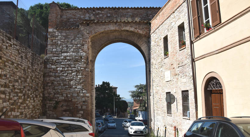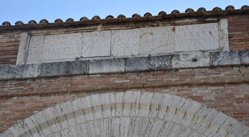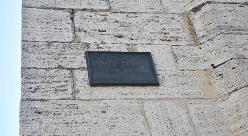 Crucia Gate, also called “Porta Nuova” (New Gate), “de Borgne” or “Porta Eburnea Nuova” (New Ivory Gate), attributed to Valentino Martelli, it is a reconstruction of 1576, of a XIII Century Door. It has a round arch with quoins in white travertine, in contrast with the red bricks of the structure. As written in the plaque above the arch, it was commissioned by Pope Governor Antonio Santacroce, from which its name.