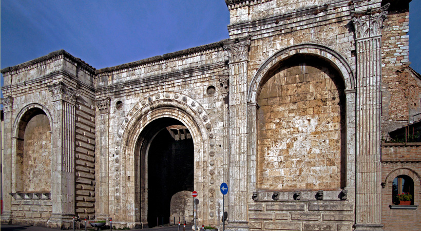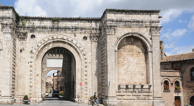 Porta della cinta medievale. E’ detta anche Porta Romana poiché rivolta a sud in direzione di Roma, dove passava la via Regale e/o Papale, percorsa dai pellegrini. Presenta da due facciate: una interna e una esterna. La più antica, di origine trecentesca e rivolta verso l’interno, ha due aperture ̶ di cui attualmente una tamponata ̶ dalle quali deriva l’antica denominazione “Porta alle Due Porte”. Essa conserva, nella parte superiore, all’interno di una nicchia, un affresco del 1765 ridipinto più volte, raffigurante la Madonna del Rosario tra i santi Francesco e Domenico. Una lapide ricorda la resistenza dei perugini contro le truppe pontificie il 20 giugno 1859.La facciata esterna, di Agostino di Duccio e del perugino Polidoro di Stefano (1475-1480), è un’opera rinascimentale concepita come arco di trionfo, rinforzata dalle due torri laterali aggettanti. L’architettura ricorda il tempio Malatestiano di Rimini di Leon Battista Alberti. Il progetto, incompiuto nel coronamento, prevedeva una maggiore altezza ed un arco minore sopra quello centrale, come nell’Arco Etrusco. Nell’intercapedine tra le due facciate si aprono due portali laterali: quello a destra introduceva alla Gabella (ufficio del dazio), mentre quello a sinistra permetteva l’accesso alla chiesa di San Giacomo ̶ di origine medievale ̶ intitolata al santo protettore dei pellegrini.