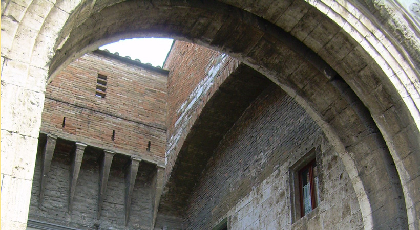 The outer façade, by Agostino di Duccio and Polidoro di Stefano (1475-1480), is a renaissance work which was imagined as a triumphal arch, reinforced by two towers on the sides. The architecture reminds the Malatestiano Temple of Rimini by Leon Battista Alberti. The arch is incomplete but in the project it was considered to be higher and with a minor arch above, like in the Arco Etrusco. In the cavity between the two façades there are two lateral portals: On the right leading to Gabella (Duty Office), on the left leading to the medieval San Giacomo Church entitled to the saint, protector of pilgrims.