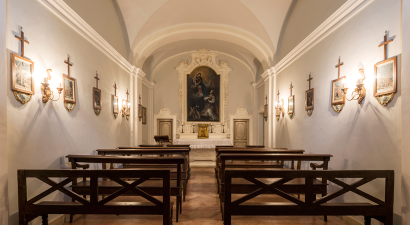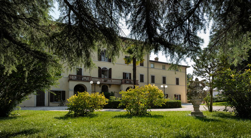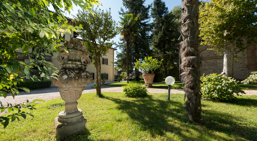 It is built with bricks with 6 central pillars and cross vaults in the ground and first floors. The inner rooms of the “piano nobile” (main floor) and the private chapel were frescoed and decorated by Francesco Appiani from Ancona and Nicola Giuli from Perugia (XVIII sec.), who had already decorated Palazzo Donini. The Villa is surrounded by a 22.000 sq m  park, with centuries old trees, surrounded still by the original walls; along one of the inner alleys five Etruscan Urns dating from the III Century B.C.